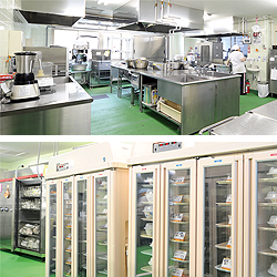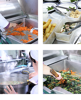 「大量調理施設衛生管理マニュアル」に基づき、衛生管理を徹底し食中毒予防に努めています。 具体的には細菌を「つけず」「増やさず」「殺菌する」ことです。 細菌を「つけない」ために、調理スタッフは手洗い、アルコール消毒をして厨房に入ります。調理スタッフは専用のユニフォーム、キャップ、シューズを着用します。 また調理器具は使用後に洗浄消毒を徹底し、雑菌・細菌が付着しやすいまな板は使用途別に分けています。1日の作業終了後は、熱殺菌をし定期的に薬品消毒を行っています。 細菌を「増やさない」ために、加熱食品は中心温度85℃1分以上を守り、ノロウィルスの対策もとっています。また調理後から食事をとる時間までをできるだけ短くするように、調理開始時間に配慮しています。 細菌を「殺菌する」ため、加熱食品は十分な加熱温度と時間をとっています。また使用した台ふきんやスポンジは殺菌漂白剤に入れて、洗濯しています。